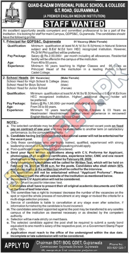 Quaid-e-Azam Divisional Public School & College, a leading private English medium institution in Gujranwala, announces staff vacancies. We are seeking a Principal for QDPS&C and School Heads for High School, College, and Junior School. Ideal candidates will have a Master's degree in a relevant field and significant experience in educational leadership. Explore these government-funded educational career opportunities for experienced professionals. This advertisement highlights the latest job openings for educators aiming for significant career development.