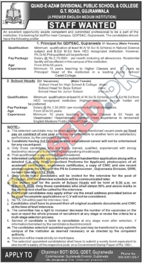 - Interview for School Heads: The written test for the posts of School Heads will be held on March 14, 2026, at 9:30 a.m. This position represents excellent Principal vacancies Gujranwala in the region. Only those candidates who obtain 50% and above marks in the written test shall be called for the interview.
