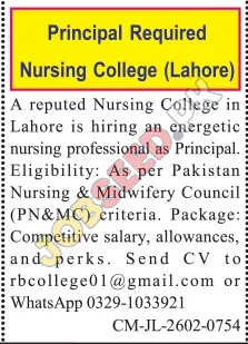 Principal Position at Reputed Nursing College in Lahore
