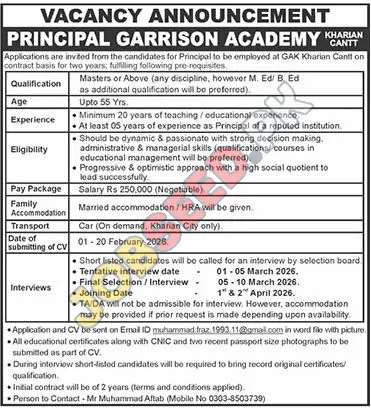 Garrison Academy, a reputable educational institution, is inviting applications for the position of Principal. This leadership role demands a dynamic individual with extensive experience in educational management. The successful candidate will be responsible for overseeing all aspects of the academy and ensuring its continued success. Explore these latest recruitment with competitive benefits. Join a leading educational institution and take your career to the next level. This is a great career opportunity for those in the education sector.