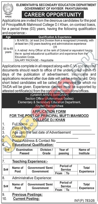 The Khyber Pakhtunkhwa government is actively hiring for Principal positions at Mufti Mahmood College D.I Khan. Ideal candidates will possess a Master's degree with teaching experience or be retired Army Officers. The roles are on a contract basis for three years. Successful candidates will have a chance to excel in a challenging and rewarding environment. Apply today and take advantage of this outstanding career opportunity!