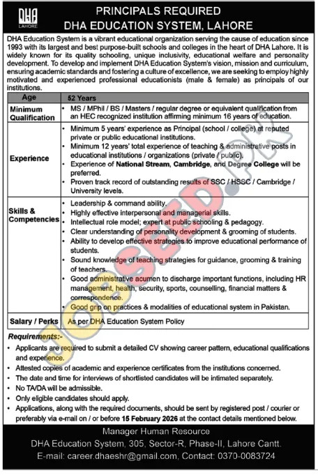Job Opportunity for Principals at DHA Education System, Lahore