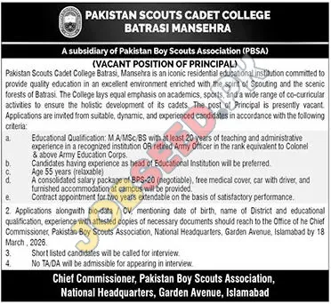 | Job Hiring Organization: | Pakistan Scouts Cadet College Batrasi Mansehra |
