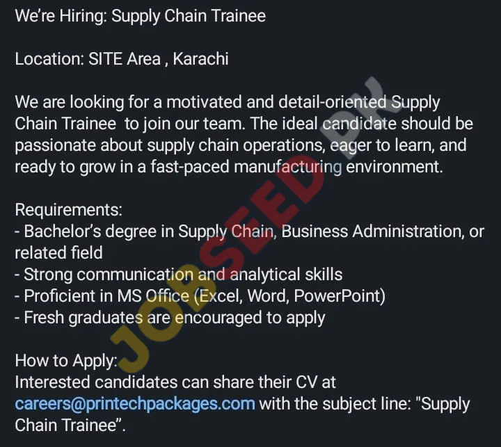 Printech Packages, Karachi invites applications from eligible candidates for the post of Supply Chain Trainee as per advertisement of 04 December, 2025, published in Online Advertisement. BA educational qualification will be preferred.