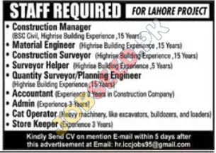 A significant construction project in Lahore is seeking experienced professionals to join their team. This is an excellent opportunity for individuals with a strong background in the construction industry to contribute to a high-profile development.