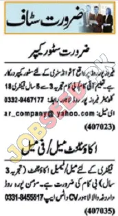 Private Factory, Lahore Punjab Pakistan invites applications from eligible candidates for the post of Store Keeper and Accountant (Male/Female) as per advertisement of 24 November, 2025, published in Nawaiwaqt Newspaper. educational qualification will be preferred.