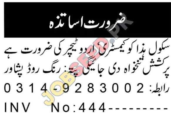 A reputable school in Peshawar is seeking dedicated and qualified teachers to join their faculty. The school requires teachers for Chemistry and Urdu subjects. This is an excellent opportunity to contribute to a vibrant educational environment and shape young minds.