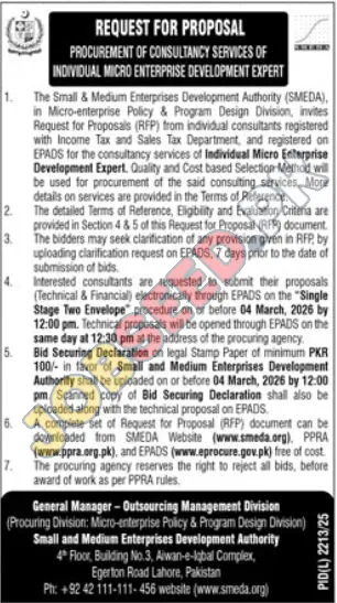 The Small & Medium Enterprises Development Authority (SMEDA), a prominent government entity, is extending an invitation for proposals to procure specialized consultancy services. This initiative focuses on securing an Individual Micro Enterprise Development Expert to significantly contribute to the authority's micro-enterprise policy and program design initiatives. This is a prime opportunity for seasoned professionals to engage in impactful public sector development work.