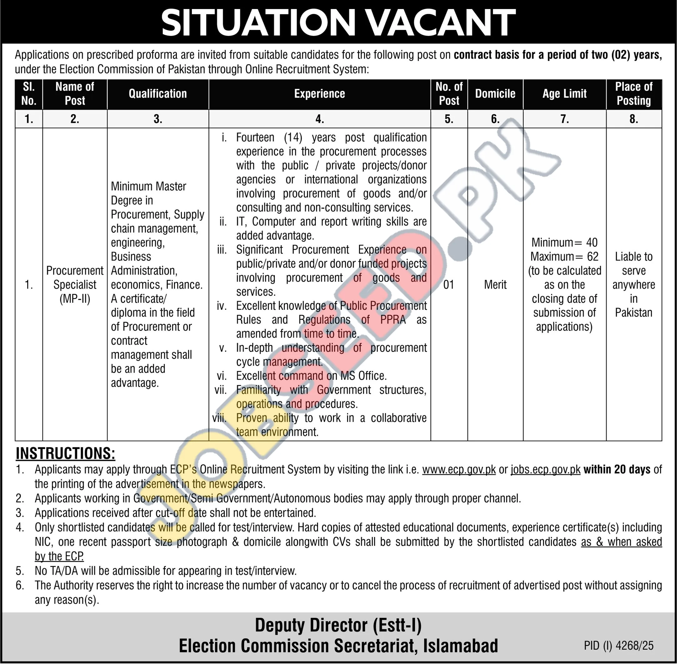 Election Commission Secretariat is now recruiting in Islamabad. Apply for the position of Procurement Specialist. The required qualification is Master. This role is within the Management industry. The application process commenced on 22 November, 2025. Interested and eligible candidates must submit their applications before the deadline on 12 December, 2025. This is a prime opportunity to join a renowned organization. For a step-by-step application guide and full eligibility criteria, please see the official advertisement on https://www.jobseed.pk.