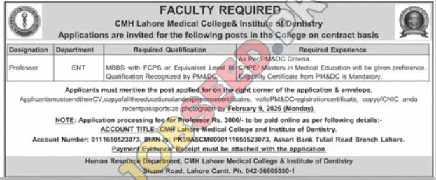 CMH Lahore Medical College & Institute of Dentistry invites applications for a Professor position in the ENT department. The required qualification is MBBS with FCPS or equivalent Level III qualification recognized by PM&DC. Candidates with CHPE or Masters in Medical Education are preferred. The application deadline is February 9, 2026. This is a contract-based position located in Lahore, Pakistan.