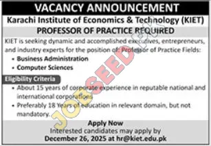 Karachi Institute of Economics & Technology (KIET) is inviting applications from dynamic executives, entrepreneurs, and industry experts for the position of Professor of Practice. These roles are designed for individuals with substantial real-world experience to contribute to the academic environment, particularly in the fields of Business Administration and Computer Sciences.