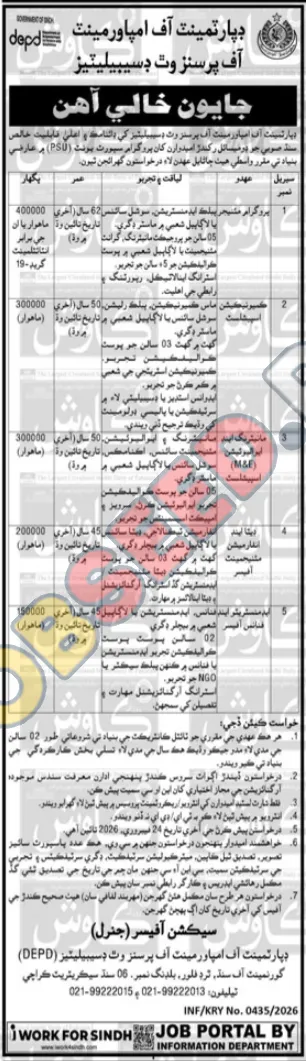 The Department of Empowerment of Persons with Disabilities (DEPD), operating under the Government of Sindh, invites applications from highly qualified and experienced professionals for various positions. These roles are offered on a contractual basis for an initial period of two years, with potential for extension based on performance. The recruitment drive seeks to fill key positions in project management, communications, and finance to enhance the department's operational capacity in Karachi.