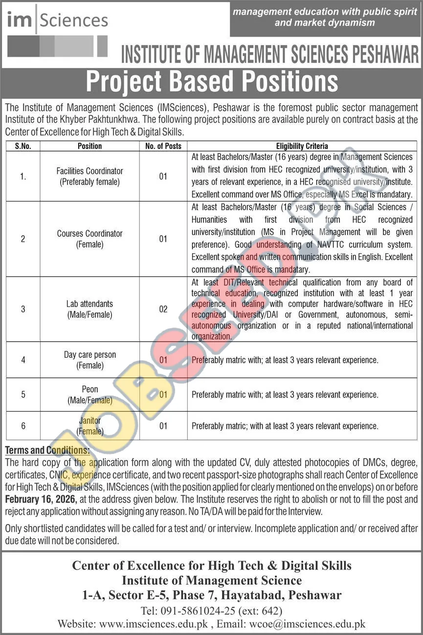 The Institute of Management Sciences (IM Sciences), Peshawar, a leading public sector management education institution, is offering exciting project-based positions on a contract basis. These opportunities are available at the Center of Excellence for High Tech & Digital Skills, providing a dynamic environment for professionals.