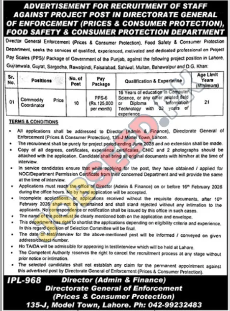 The Directorate General of Enforcement (Prices & Consumer Protection) has announced new government job vacancies for the position of Commodity Price Coordinator. This project-based role requires candidates with 16 years of education in Computer Science or a related field, or a Diploma in Information Technology with 2 years of experience. The position offers a monthly salary of Rs. 125,000 and is based in Lahore, with potential postings in other major cities of Punjab. Interested applicants must submit their applications by the deadline of February 16, 2026.