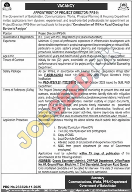 The Government of Balochistan is seeking a dynamic and experienced professional to fill the role of Project Director (PPS-9) on a contract basis. This position is crucial for the "Construction of 110 Km Road Chedagi Iran Border to Panjgur" project. Ideal candidates should possess a strong background in infrastructure development and project management.