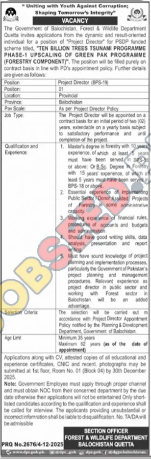 The Government of Balochistan, through its Forest & Wildlife Department in Quetta, is seeking a dynamic and results-driven individual to serve as a Project Director for the PSDP-funded "Ten Billion Trees Tsunami Programme Phase-1 Upscaling of Green Pak Programme (Forestry Component)." This is a contract-based position aligned with the department's appointment policies, offering an exciting opportunity to contribute to a significant environmental initiative.