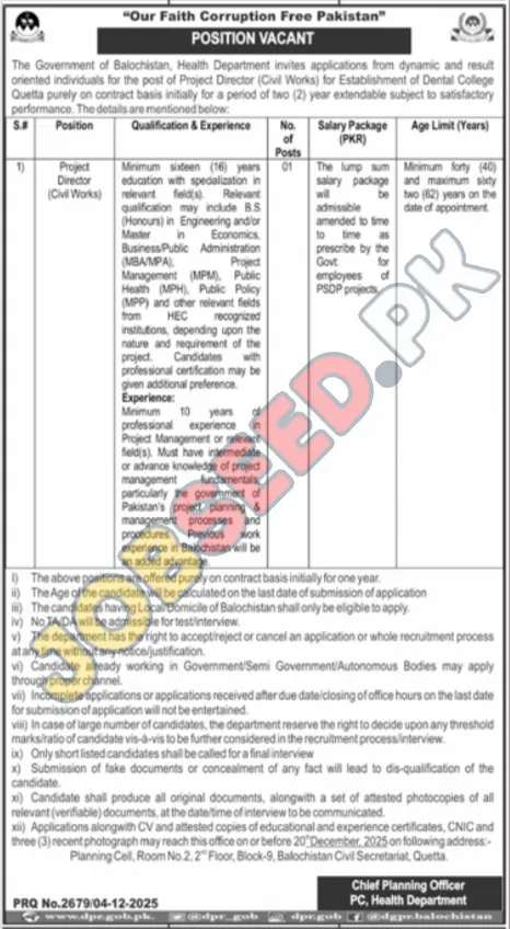 Health Department is now recruiting in Quetta. Apply for the position of Project Director (Civil Works). The required qualification is Master. This role is within the Management industry. The application process commenced on 05 December, 2025 via Jang Newspaper. Interested and eligible candidates must submit their applications before the deadline on 20 December, 2025. This is a prime opportunity to join a renowned organization. For a step-by-step application guide and full eligibility criteria, please see the official advertisement on https://www.jobseed.pk.