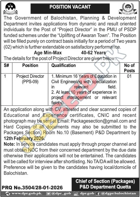 The Government of Balochistan, Planning & Development Department (a government entity) is seeking a skilled Project Director (PPS-09) to oversee and manage projects within the 'Uplifting of Awaran Town' initiative. This is a contract-based employment opportunity, offering a chance to contribute to vital development projects. The position requires a candidate with relevant educational qualifications and extensive experience in project management. Apply now to leverage this career development opportunity with a competitive salary and contribute to the public sector.