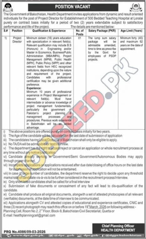 Explore exciting government job opportunities in Balochistan with the Health Department. We are seeking a dynamic Project Director for a 500 Bedded Teaching Hospital in Loralai. This contract-based role offers a competitive salary package and the chance to contribute significantly to public health infrastructure. Ideal candidates will possess extensive experience in project management and a strong academic background. Discover your next career move in the public sector and make a difference. This position represents excellent high salary jobs in the region.