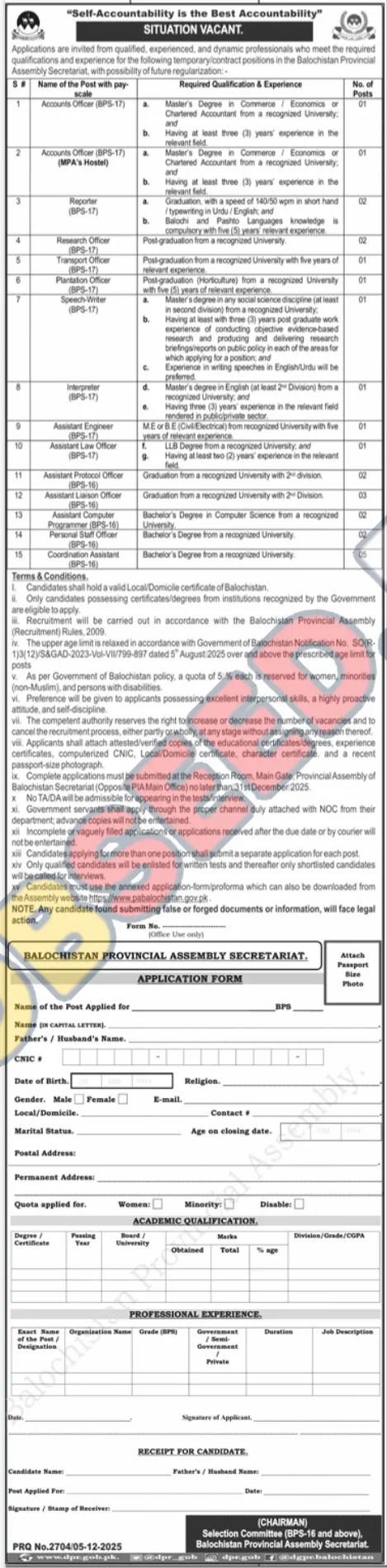 Provincial Assembly Secretariat, Quetta Balochistan Pakistan invites applications from eligible candidates for the post of Accounts Officer, Accounts Officer, Reporter, Research Officer, Transport Officer, Plantation Officer, Speech-Writer, Interpreter, Assistant Engineer, Assistant Law Officer, Assistant Protocol Officer, Assistant Liaison Officer, Assistant Computer Programmer, Personal Staff Officer and Coordination Assistant as per advertisement of 06 December, 2025, published in Jang Newspaper. Master, Bachelor, BE, LLB educational qualification will be preferred.