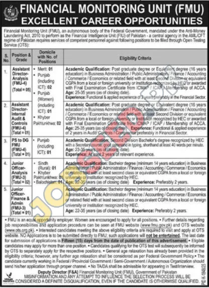 Interested individuals should apply directly to Financial Monitoring Unit FMU for these vacancies in the Management division. The estimated application deadline is 15 December, 2025, but please verify the exact date in the official advertisement. To understand the application process and explore other job openings at Financial Monitoring Unit FMU, visit the official source or see more details on https://www.jobseed.pk.