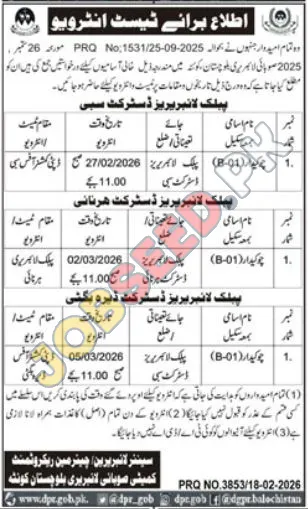 The Balochistan Provincial Library announces interview schedules for multiple Chowkidar positions in the Sibi, Harnai, and Dera Bugti districts. Candidates will be interviewed on the specified dates and locations. This is a opportunity within the Balochistan government sector. Successful candidates will benefit from these Balochistan Provincial Library jobs in Quetta.