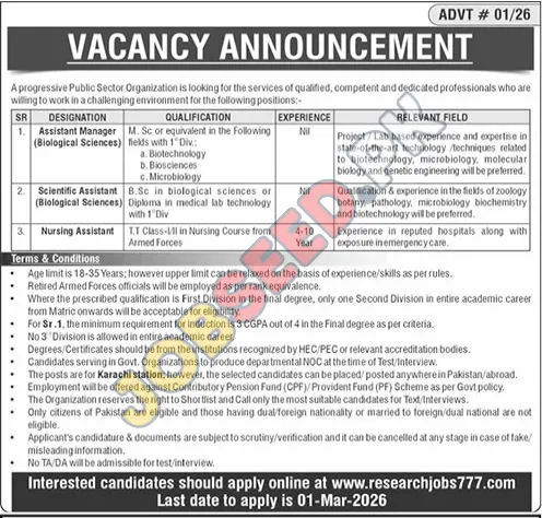 A progressive public sector organization in Pakistan is announcing career openings for skilled individuals. The available positions include Assistant Manager (Biological Sciences), requiring an M.Sc. or equivalent with 1st Division in Biotechnology, Biosciences, or Microbiology. Scientific Assistant (Biological Sciences) roles are open to candidates with a B.Sc. in biological sciences or a Diploma in Medical Lab Technology with 1st Division. Additionally, Nursing Assistant positions are available for T.T Class-VII in Nursing Course from Armed Forces. These government jobs offer a platform for professional development and contribute to public service. Additionally, Latest Government Administration careers are available for qualified candidates. Interested applicants should review the terms and conditions carefully before submitting their applications online.
