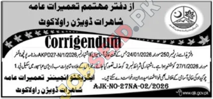 The Public Works Department (PWD) Highways Division in Rawalakot, Azad Jammu and Kashmir (AJK), has issued a corrigendum regarding recent temporary job openings. This notice clarifies a previous advertisement (AKPD27-N/1/2026) published on January 24, 2026. The correction specifically addresses condition number 2 of the original advertisement, which has now been withdrawn. The department invites applications from eligible candidates for various temporary positions within the Highways Division. This presents an excellent opportunity for professionals seeking government employment and career development in the public sector. Interested individuals are encouraged to review the updated requirements and apply promptly for these latest job vacancies in Rawalakot.