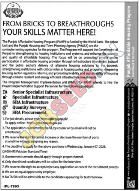 Punjab Affordable Housing Program (PAHP), Lahore invites applications from eligible candidates for the post of Senior Specialist Infrastructure, Specialist Infrastructure, SRA Infrastructure, Quantity Surveyor and SRA Procurement as per advertisement of 25 December, 2025. BA educational qualification will be preferred.
