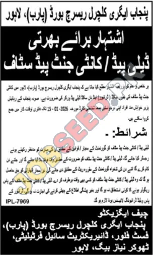 Punjab Agriculture Research Board (PARB), Lahore invites applications from eligible candidates for the post of Daily Paid/Contingent Paid Staff as per advertisement of 25 December, 2025. Master educational qualification will be preferred.