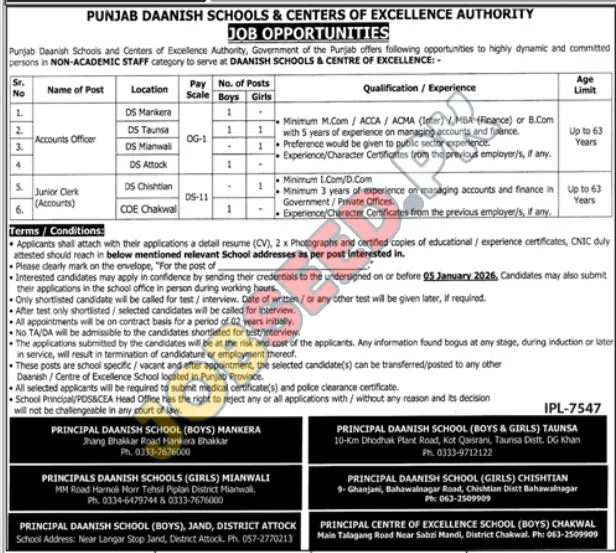 Punjab Daanish Schools & Center Of Excellence Authority, Mianwali Punjab Pakistan invites applications from eligible candidates for the post of Accounts Officer, Accounts Officer, Accounts Officer, Accounts Officer and Junior Clerk as per advertisement of 18 December, 2025, published in Jang Newspaper. BA, Diploma educational qualification will be preferred.