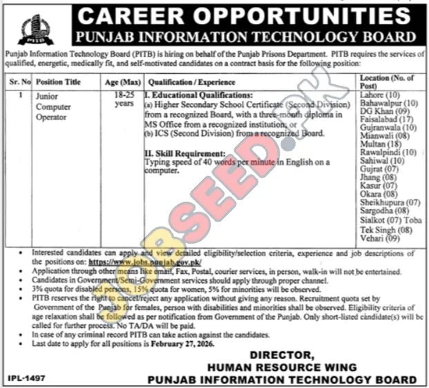 Discover exciting government job opportunities with the Punjab Information Technology Board (PITB) as they recruit for Junior Computer Operator positions on behalf of the Punjab Prisons Department. This is a fantastic chance for qualified individuals to secure a contract-based role within a reputable public sector organization. Successful candidates will benefit from these career development. We are seeking energetic, medically fit, and self-motivated candidates to join our team. Explore career advancement and contribute to public service. This role offers a competitive salary and a chance to grow professionally. Find your next government career move with PITB.