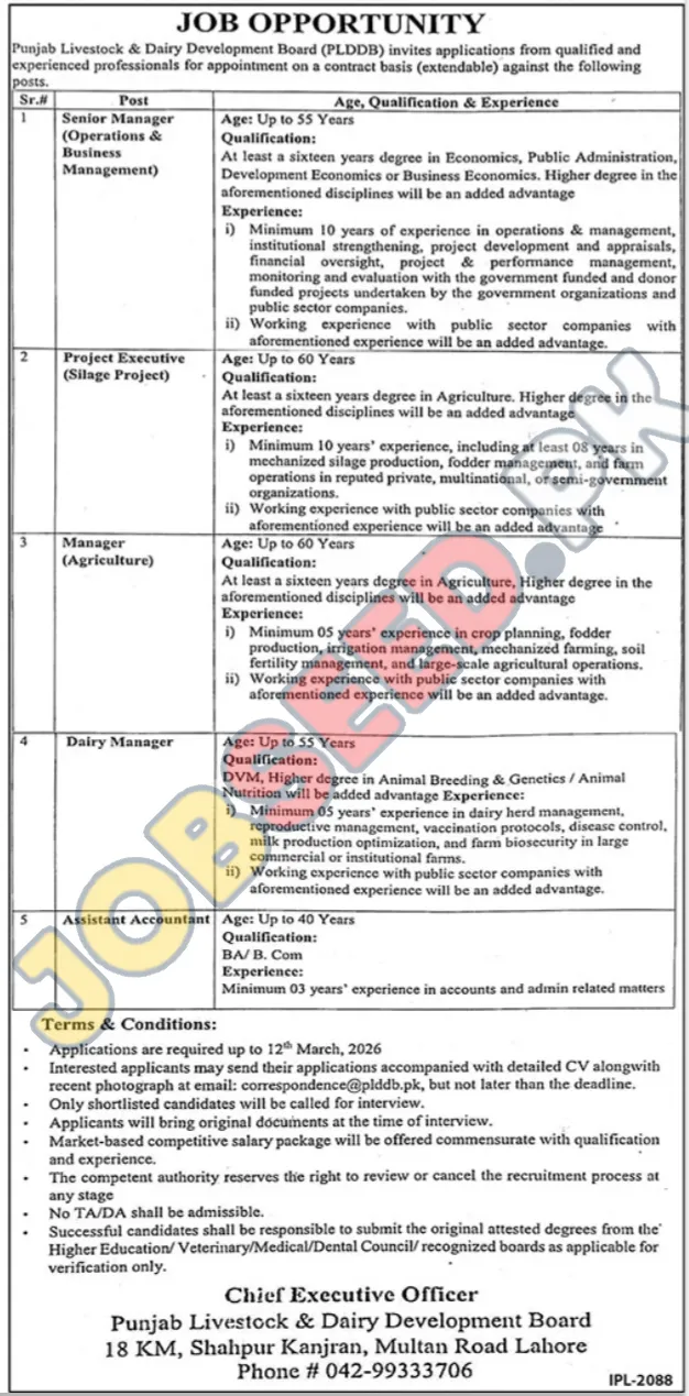 Government job openings in Punjab, Pakistan, for experienced professionals in the livestock and dairy sector. The Punjab Livestock & Dairy Development Board (PLDDB) is hiring for contract positions including Senior Manager (Operations & Business Management), Project Executive (Silage Project), Manager (Agriculture), Dairy Manager, and Assistant Accountant. These roles require specific educational qualifications and significant experience in relevant fields. Successful candidates will receive a competitive salary and the opportunity for professional growth within a government organization. Apply by March 12, 2026, for these esteemed career prospects.