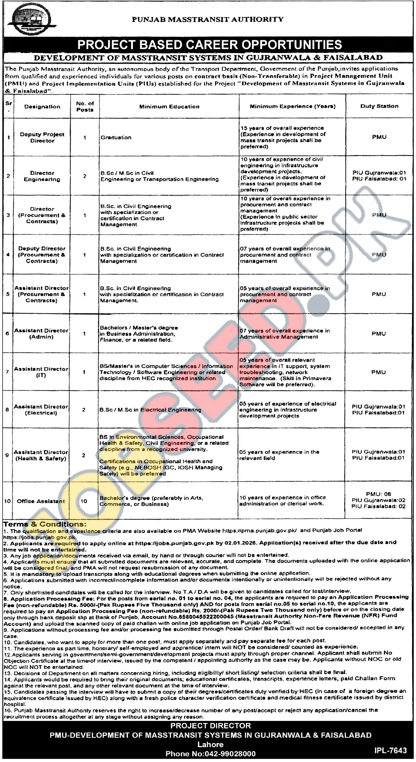 Join the team at Punjab Masstransit Authority PMA in Lahore, Punjab. They are seeking to hire 10 qualified individuals for the roles of Deputy Project Director, Director Engineering, Director (Procurement & Contracts), Deputy Director (Procurement & Contracts), Assistant Director (Procurement & Contracts), Assistant Director (Admin), Assistant Director (IT), Assistant Director (Electrical), Assistant Director (Health & Safety) and Office Assistant. This is a Full-Time position. This career opportunity was advertised on 18 December, 2025 in Tribune Newspaper. The last date to apply is 02 January, 2026. Don't miss this chance to advance your career with Punjab Masstransit Authority PMA. For more information and to apply online, visit https://www.jobseed.pk.