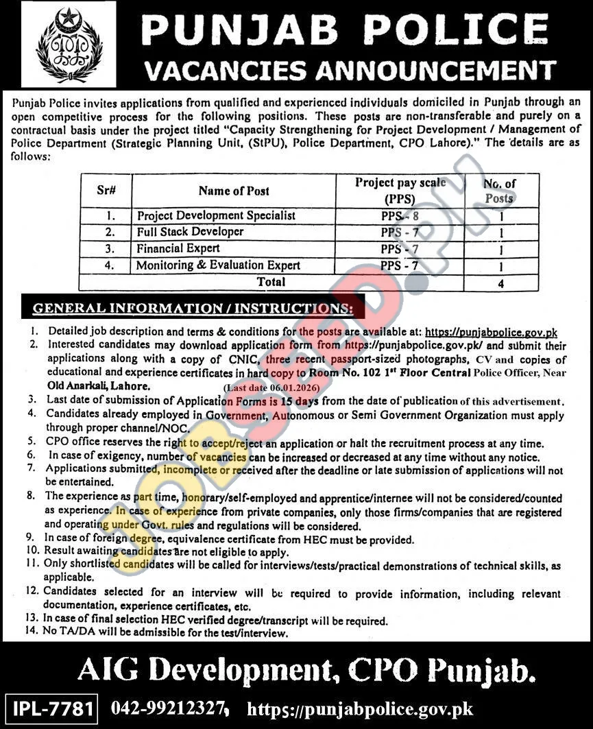 Punjab Police, Lahore invites applications from eligible candidates for the post of Project Development Specialist, Full Stack Developer, Financial Expert and Monitoring & Evaluation Expert as per advertisement of 22 December, 2025. Bachelor, Master educational qualification will be preferred.