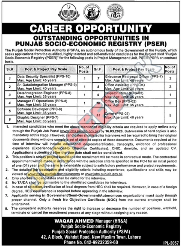 The Punjab Social Protection Authority (PSPA), a key autonomous body under the Government of Punjab, is opening doors for talented and motivated individuals to join the Punjab Socio-Economic Registry (PSER) project. This initiative offers exciting contract-based positions within the Project Management Unit, providing a significant opportunity for career advancement in the public sector.