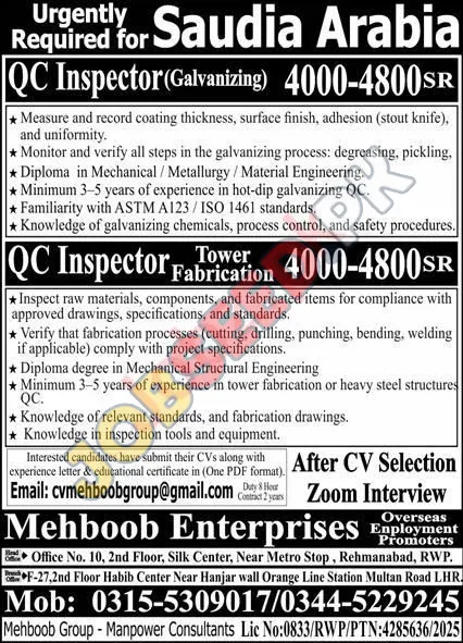 Career opportunity at Mehboob Enterprises Overseas Employment Promoters located in Saudi Arabia Saudi Arabia Pakistan for the position of QC Inspector (Galvanizing). This employment notice was announced on 30 November, 2025 through Express Newspaper. Candidates possessing a Diploma degree are encouraged to submit their application.