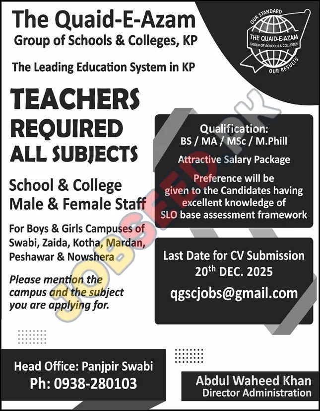 The Quaid-E-Azam Group of Schools & Colleges, recognized as a leading education system in Khyber Pakhtunkhwa (KP), is seeking qualified and dedicated male and female staff for teaching positions across various subjects. These roles are available at multiple campuses, including Swabi, Zaida, Kotha, Mardan, Peshawar, and Nowshera.