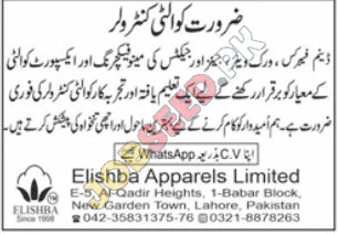 Seeking a dedicated Quality Controller for Elishba Apparels Limited, a leading private sector textile manufacturer. This position requires a strong understanding of quality assurance for denim, shirts, workwear, and knitwear, alongside import quality checks. Ideal candidates will possess relevant educational qualifications and practical experience in apparel quality control. This role offers a chance to contribute to a reputable organization and advance your career in the textile industry. Explore exciting job openings and employment opportunities.