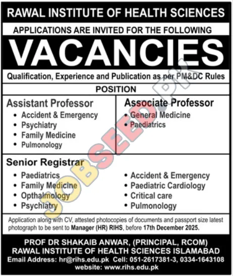 Rawal Institute of Health Sciences, Islamabad Islamabad Pakistan invites applications from eligible candidates for the post of Assistant Professor (Accident & Emergency), Assistant Professor (Psychiatry), Assistant Professor (Family Medicine), Assistant Professor (Pulmonology), Associate Professor (General Medicine), Associate Professor (Paediatrics), Senior Registrar (Paediatrics), Senior Registrar (Family Medicine), Senior Registrar (Ophthalmology), Senior Registrar (Psychiatry), Senior Registrar (Accident & Emergency), Senior Registrar (Paediatric Cardiology), Senior Registrar (Critical Care) and Senior Registrar (Pulmonology) as per advertisement of 07 December, 2025, published in Jang Newspaper. Master, PhD educational qualification will be preferred.