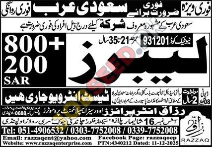 Razzaq Enterprises, Dammam Saudi Arabia Pakistan invites applications from eligible candidates for the post of Lecturer, Steel Fixer, Electrician, Grinder Man, Head Crane Operator, Fabricator, Fork Lift Operator, Batching Plant Utility Helper, Retoucher and Sealant Man as per advertisement of 13 December, 2025, published in Express Newspaper. Master, Middle, Diploma, Bachelor educational qualification will be preferred.
