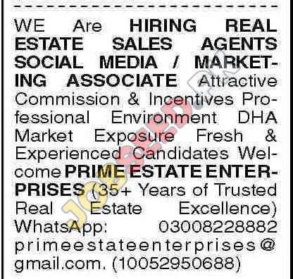 Prime Estate Enterprises is seeking talented Sales Agents and Social Media/Marketing Associates. Join a trusted real estate firm with 35+ years of experience! Explore these career opportunities with competitive benefits. Benefit from attractive commissions, a professional environment, and exposure to the DHA market. Apply now for Sales Executive positions!