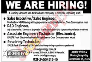 Career opportunity at Prodigy Technologies located in Karachi Sindh Pakistan for the position of Repairing Technician. This employment notice was announced on 30 November, 2025 through Jang Newspaper. Candidates possessing a DAE degree are encouraged to submit their application.
