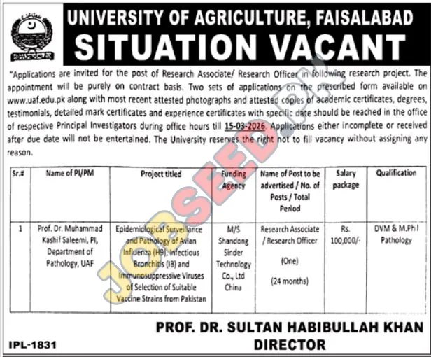 The University of Agriculture, Faisalabad, a prominent government sector institution, is announcing exciting career prospects for qualified individuals. They are seeking to fill the position of Research Associate/Research Officer for a significant research project. This role offers a unique opportunity to contribute to vital research in the field of agricultural science, specifically focusing on epidemiological surveillance and the pathology of avian influenza and related viruses. Successful candidates will be engaged on a contract basis, providing a structured period for impactful work and professional development.