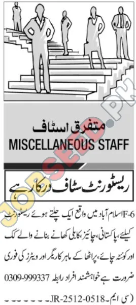 Restaurant, Islamabad Islamabad Pakistan invites applications from eligible candidates for the post of Restaurant Staff as per advertisement of 18 December, 2025, published in Jang Newspaper. Matric educational qualification will be preferred.