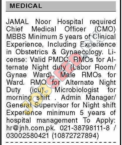 Jamal Noor Hospital JNH is now recruiting in Karachi. Apply for the position of RMOs. The required qualification is MBBS. This role is within the Medical industry. A bachelor degree is preferred. The application process commenced on 24 November, 2025 via Dawn Newspaper. Interested and eligible candidates must submit their applications before the deadline on 09 December, 2025. This is a prime opportunity to join a renowned organization. For a step-by-step application guide and full eligibility criteria, please see the official advertisement on https://www.jobseed.pk.