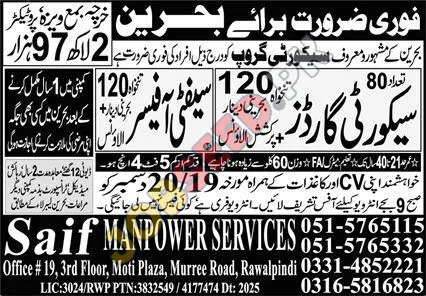 Saif Manpower Services, Bahrain Bahrain Pakistan invites applications from eligible candidates for the post of Security Guards and Safety Officer as per advertisement of 18 December, 2025, published in Express Newspaper. Matric, Diploma educational qualification will be preferred.