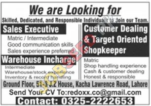 Sales Executive and Warehouse Incharge Jobs in Lahore
