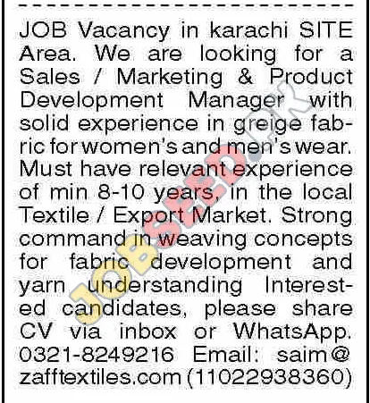 Zaff Textiles is looking for a Sales / Marketing & Product Development Manager. The position requires a minimum of 8-10 years of experience with greige fabric, along with a solid understanding of the local Textile / Export Market. The candidate should be adept at fabric development and possess knowledge of yarn. This is an exciting employment opportunity with a leading private sector organization, offering a chance for professional career development.
