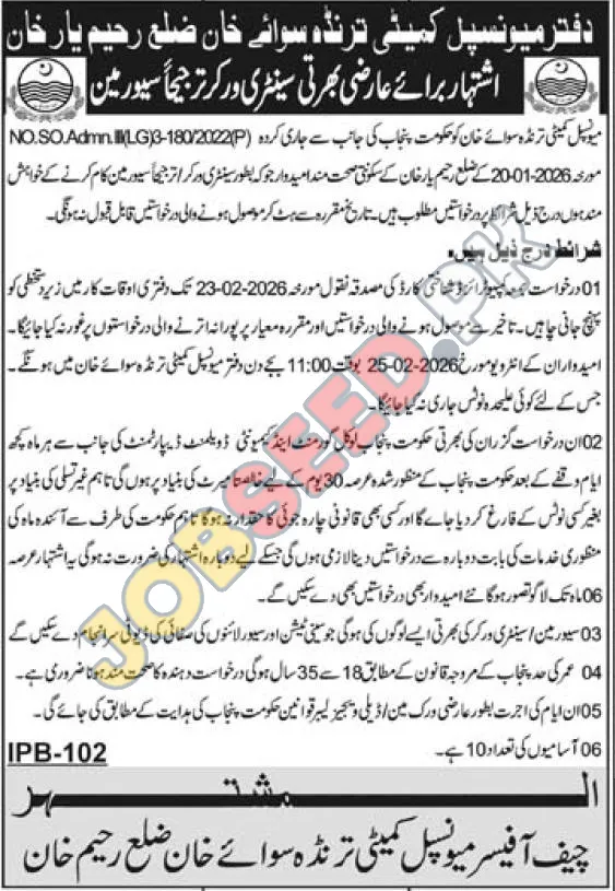 The Municipal Committee Trinda Sawai Khan is currently hiring for temporary Sanitary Worker positions in Rahim Yar Khan, Punjab. These government job vacancies offer a chance for local residents to join the public sector workforce. Candidates must meet specific age and physical requirements for sanitation duties. The application deadline is February 23, 2026. This advertisement provides details on how to apply for these public sector careers.